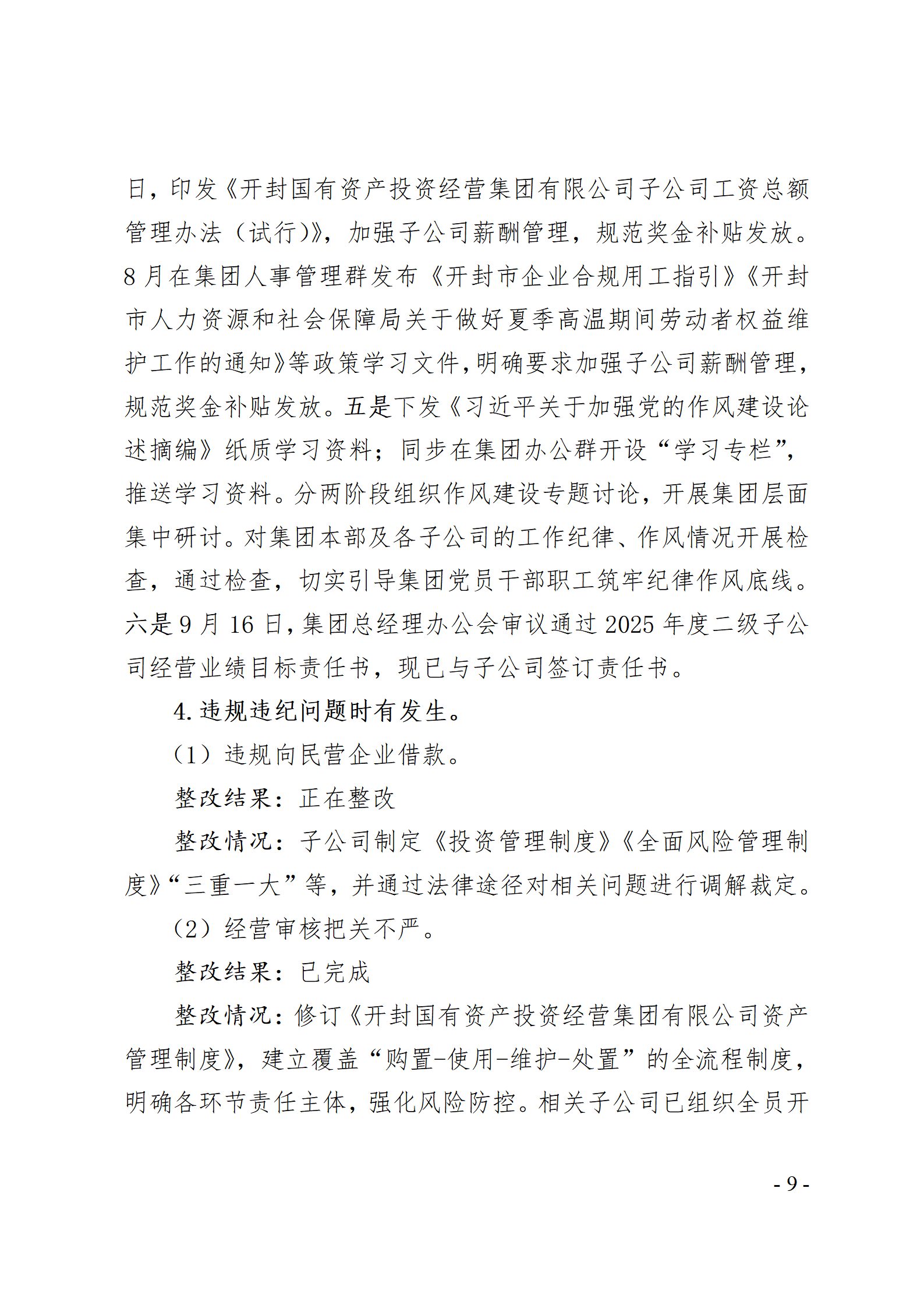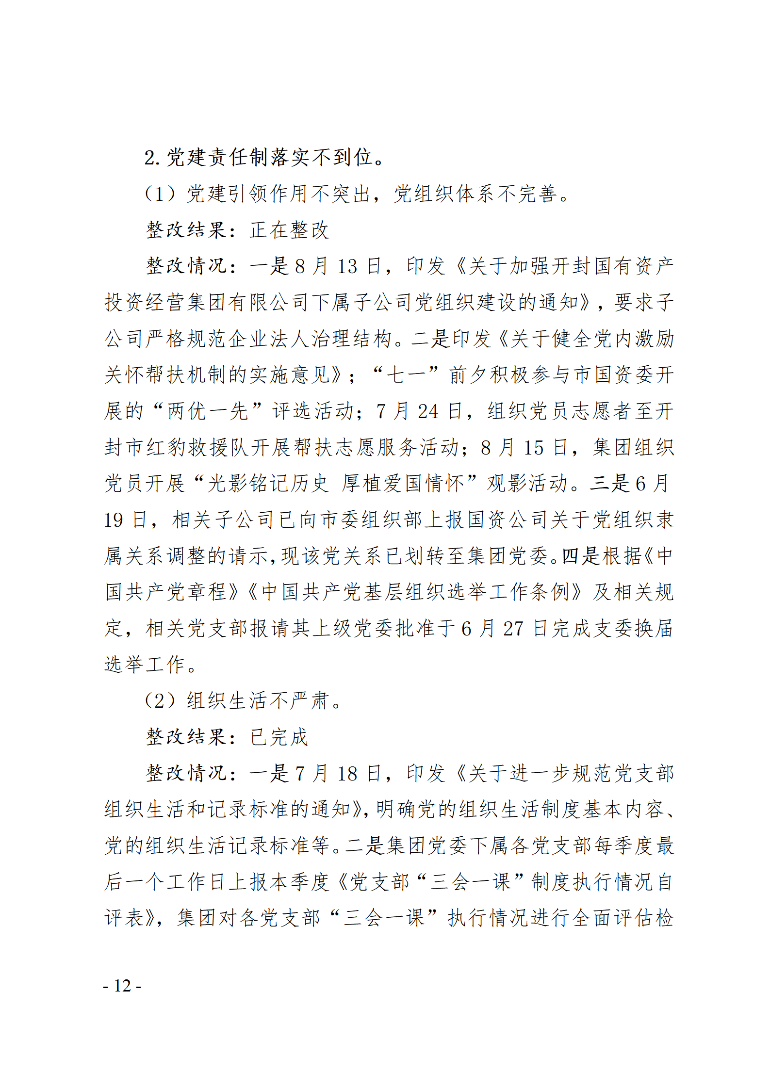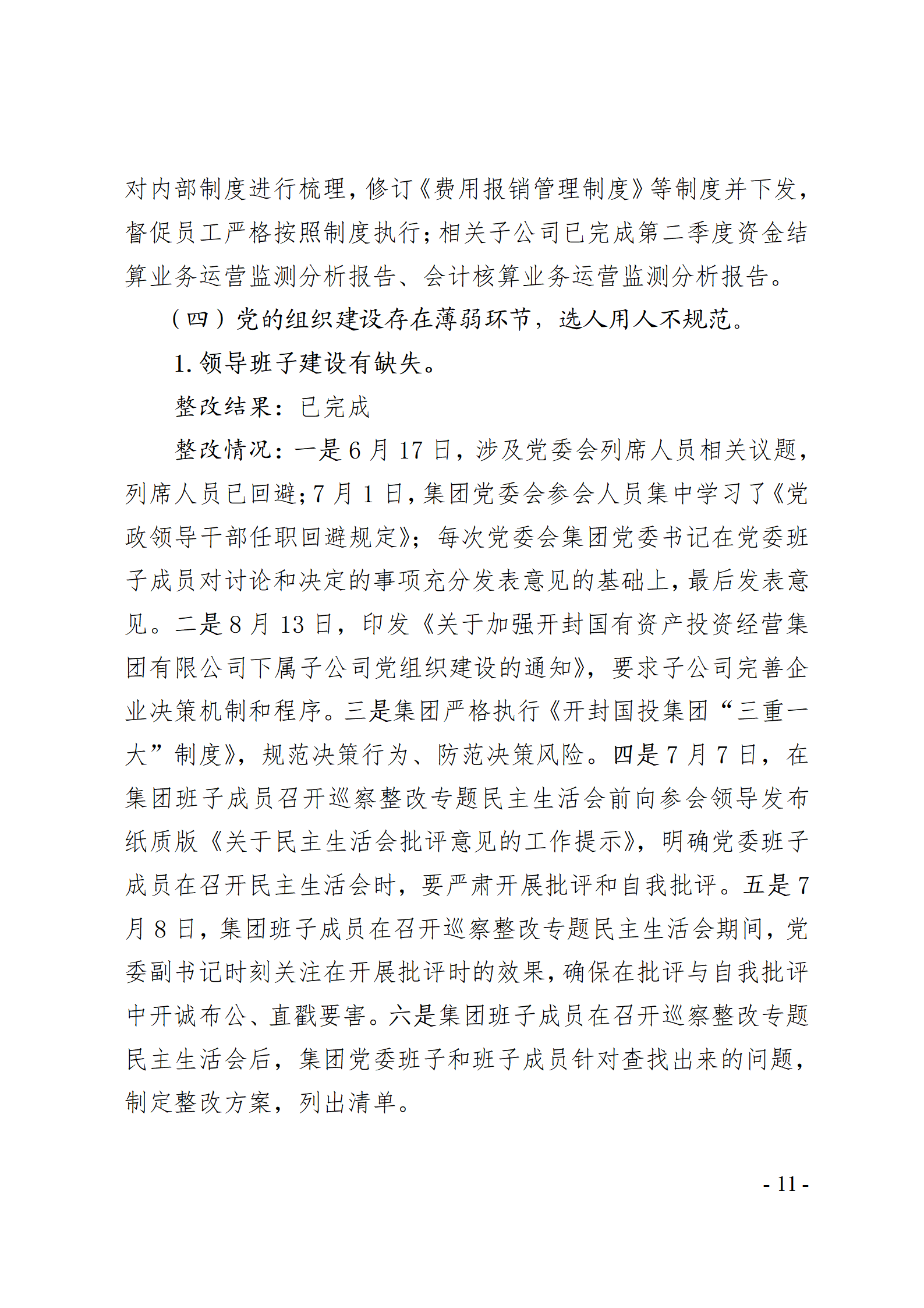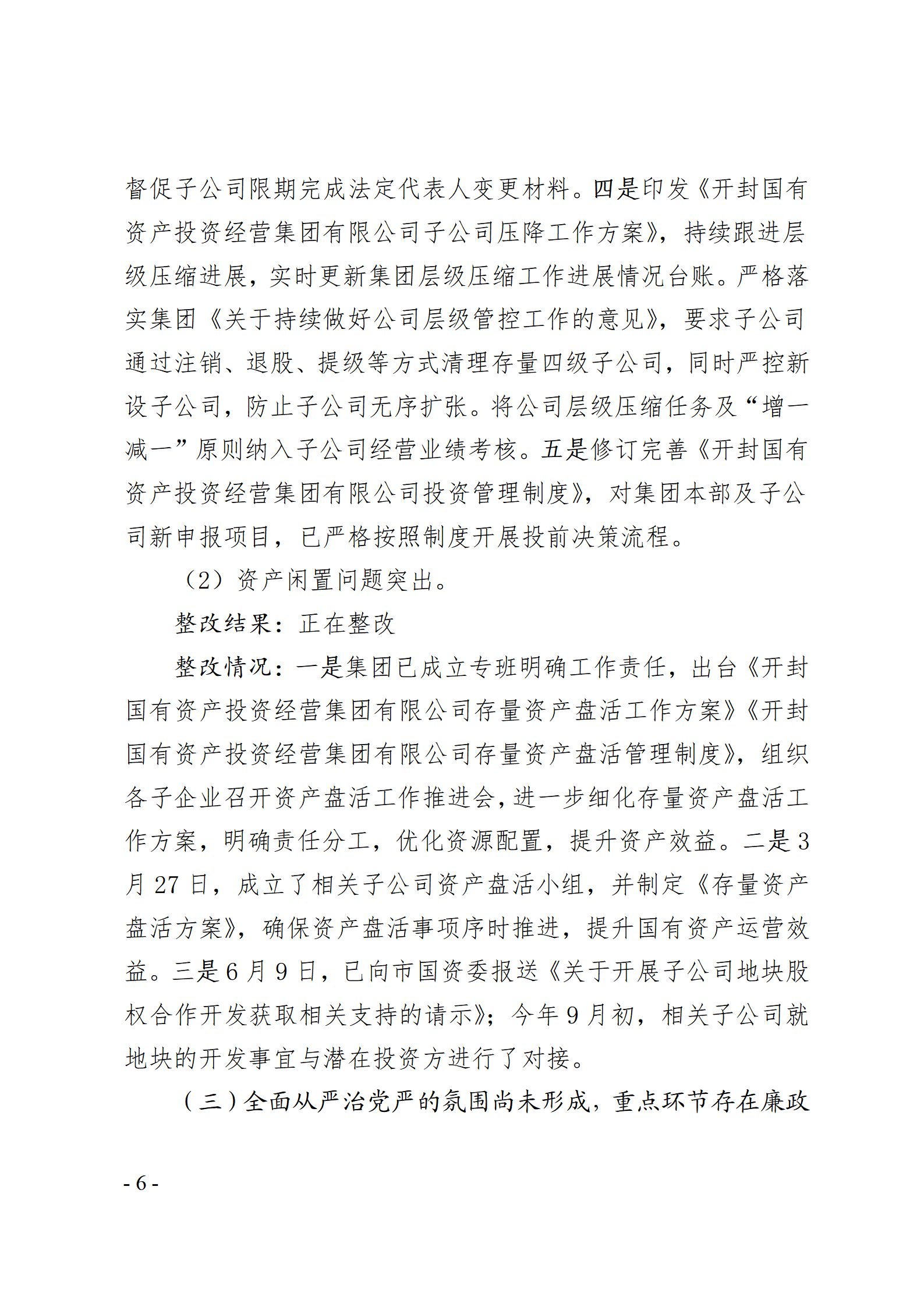 开封国有资产投资经营集团有限公司党委关于巡察整改情况的通报